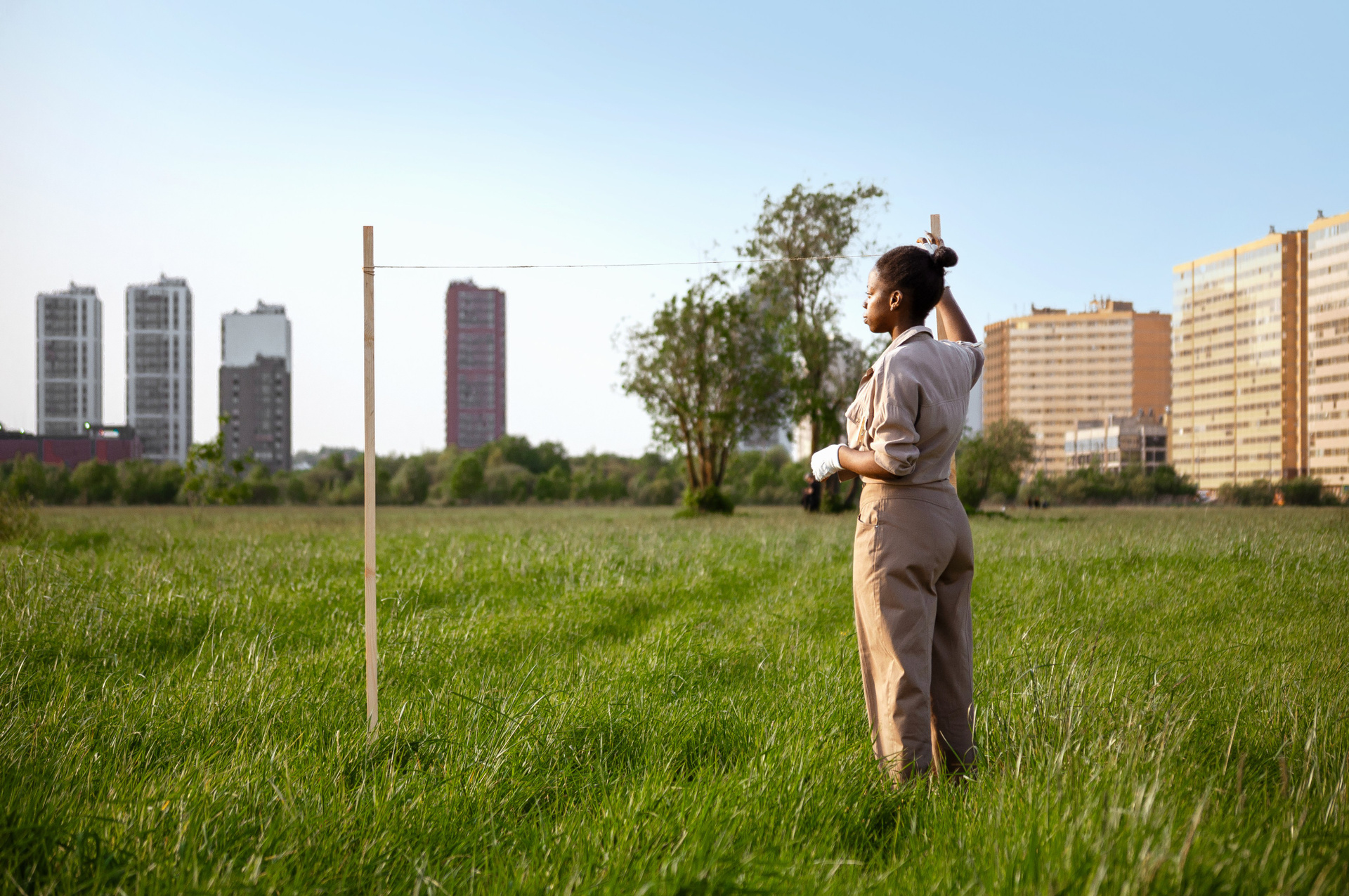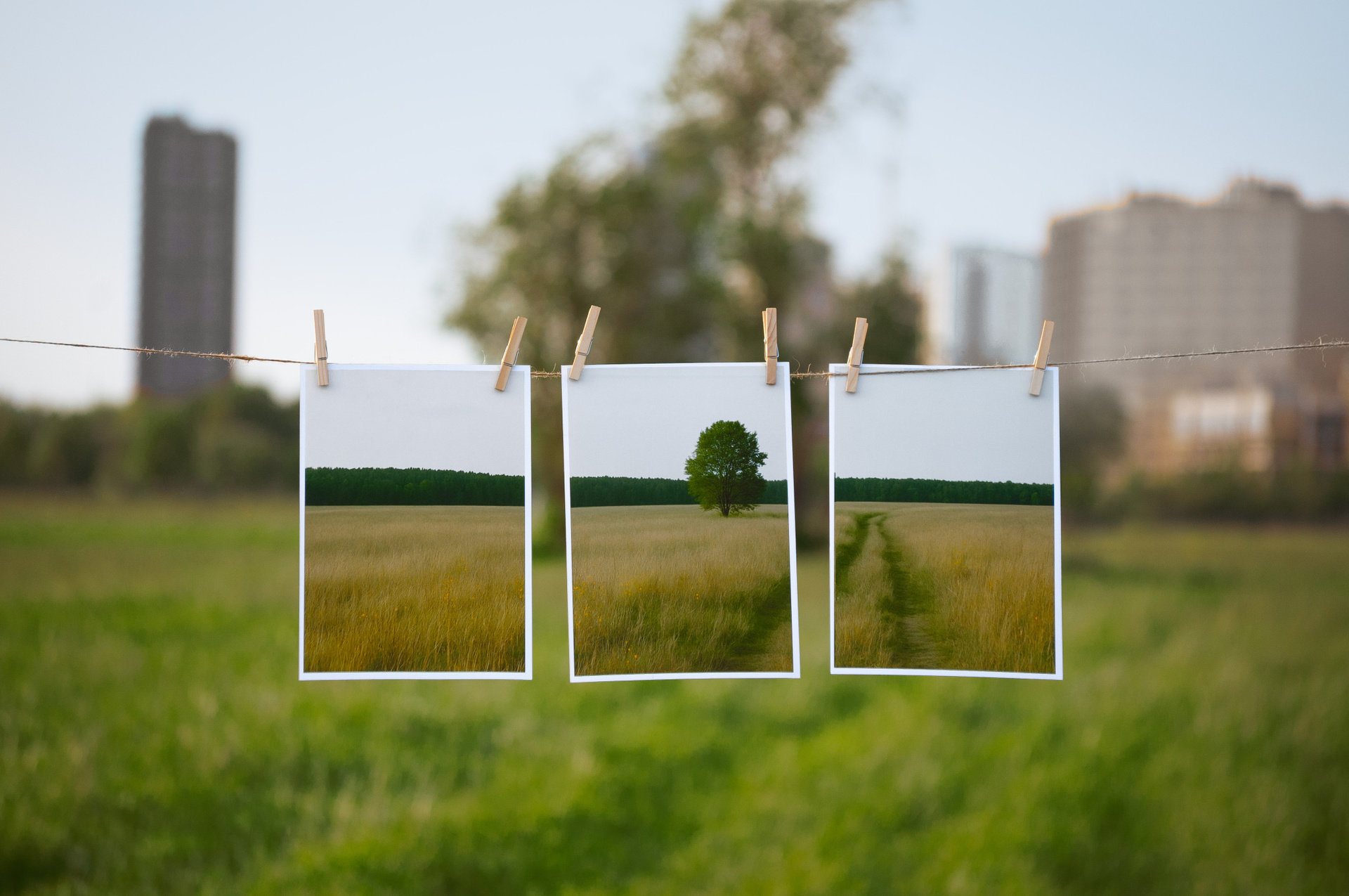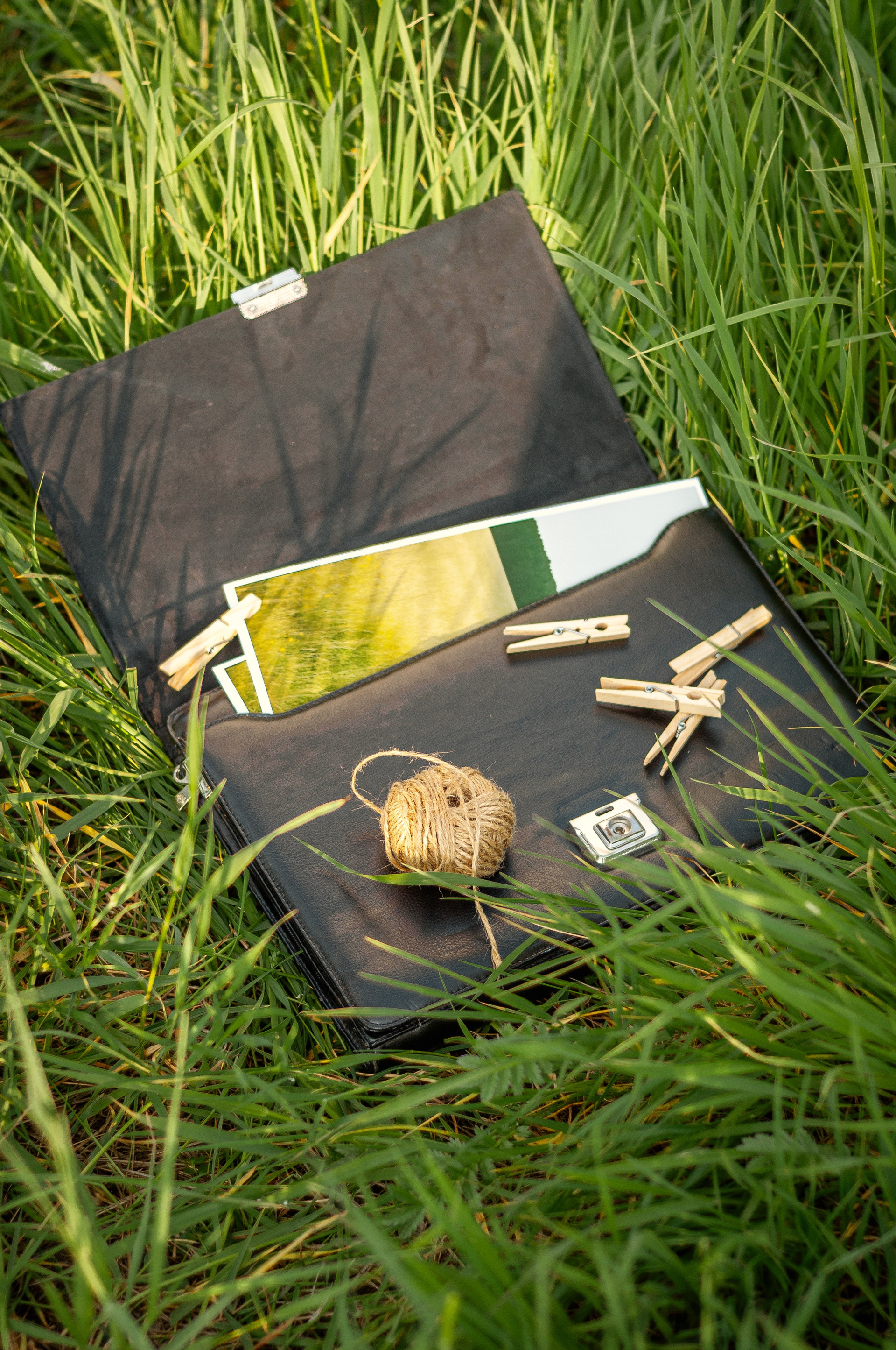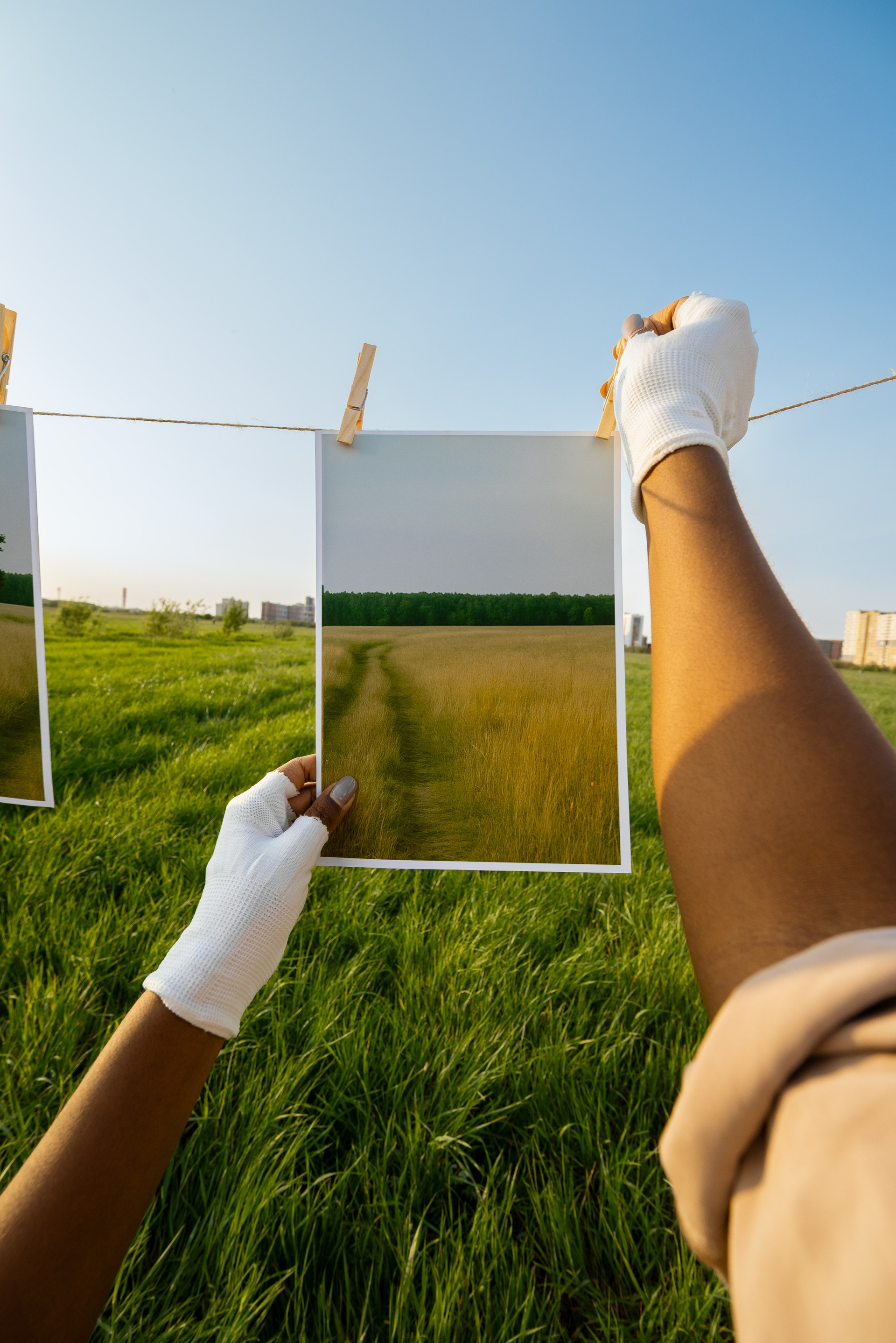 Девушка развесила снимки на прищепки перед безжизненным урбанистическим фоном. Её живые образы вступили в диалог с бетонными фасадами.