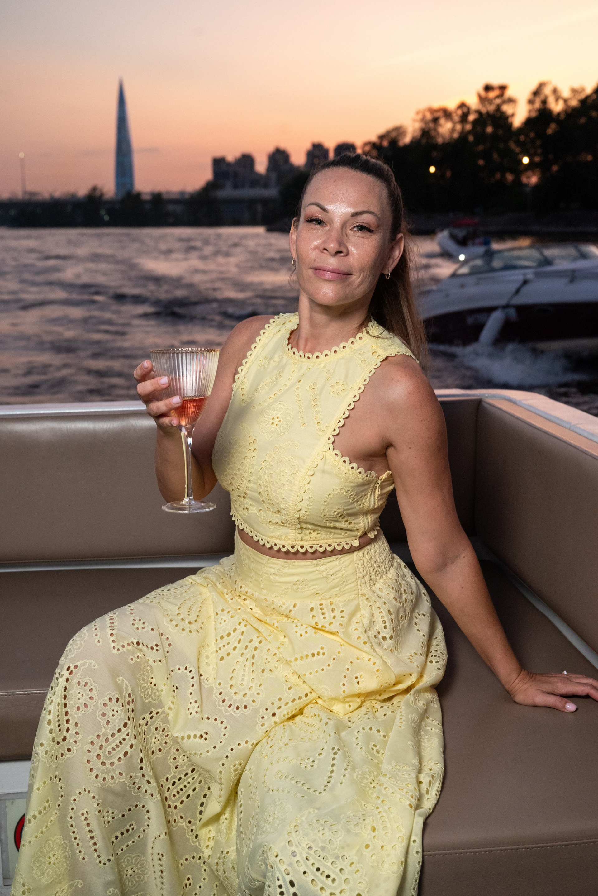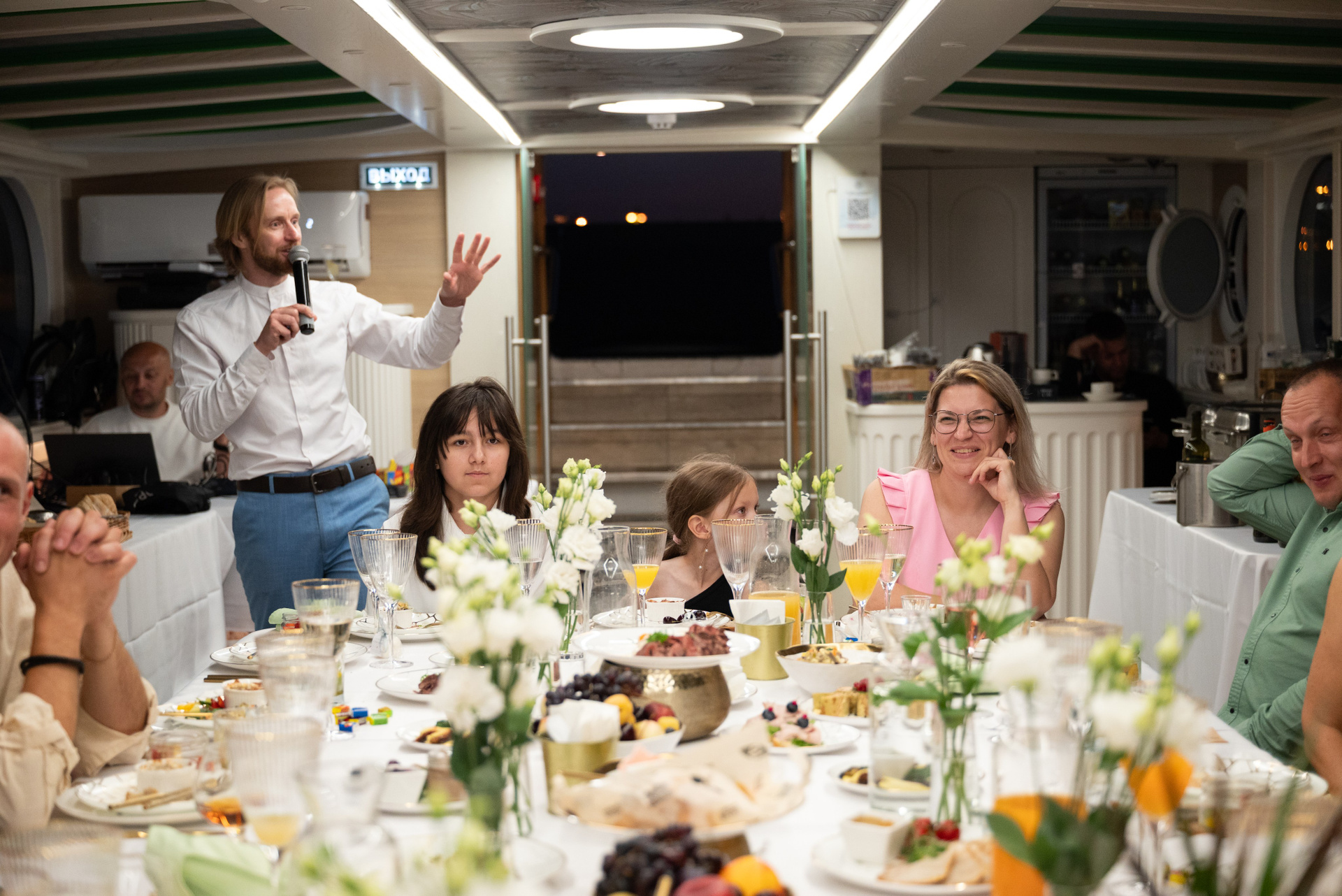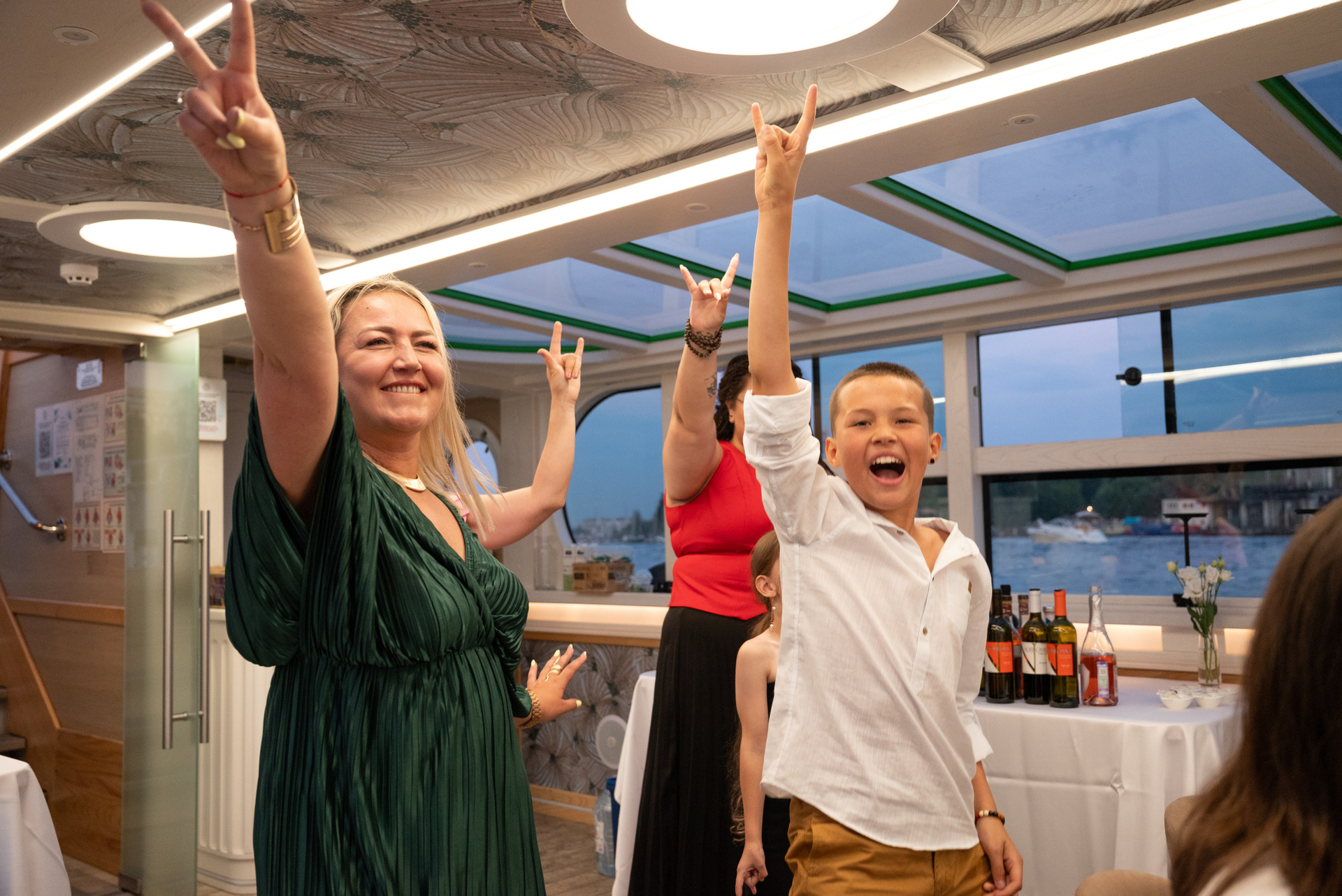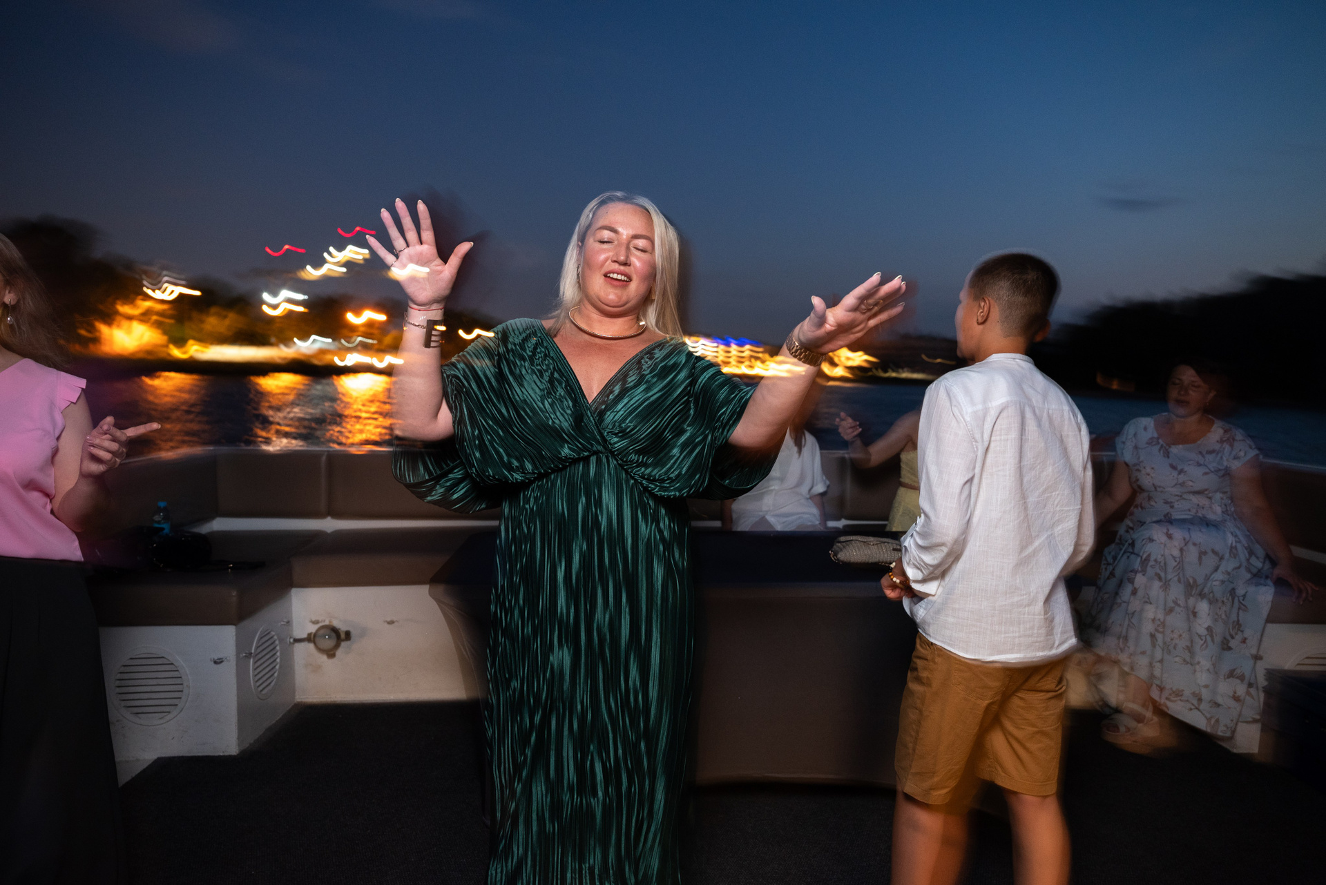 Теплоход стал сценой для праздника. Город остался на берегу, а на палубе — только смех, танцы и искренние взгляды.